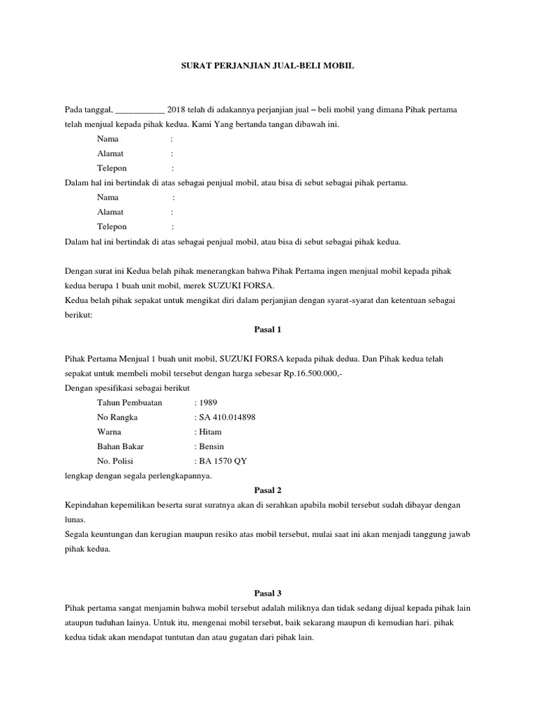 Mobil merupakan barang kendaraan yang nilainya terbilang cukup besar. Dalam surat perjanjian jual beli tanah ini disebut sebagai pihak pembeli. Ada baiknya pembeli mengetahui contoh surat jual beli tanah yang resmi supaya tidak mudah tertipu oleh oknum tertentu. Contoh surat perjanjian jual beli kendaraan mobil bekas. Dalam transaksi jual beli seperti kendaraan bermotor maupun mobil yang sah, tentu dibuktikan dengan keberadaan surat perjanjian jual beli mobil ataupun motor yang ditandatangani kedua belah pihak.